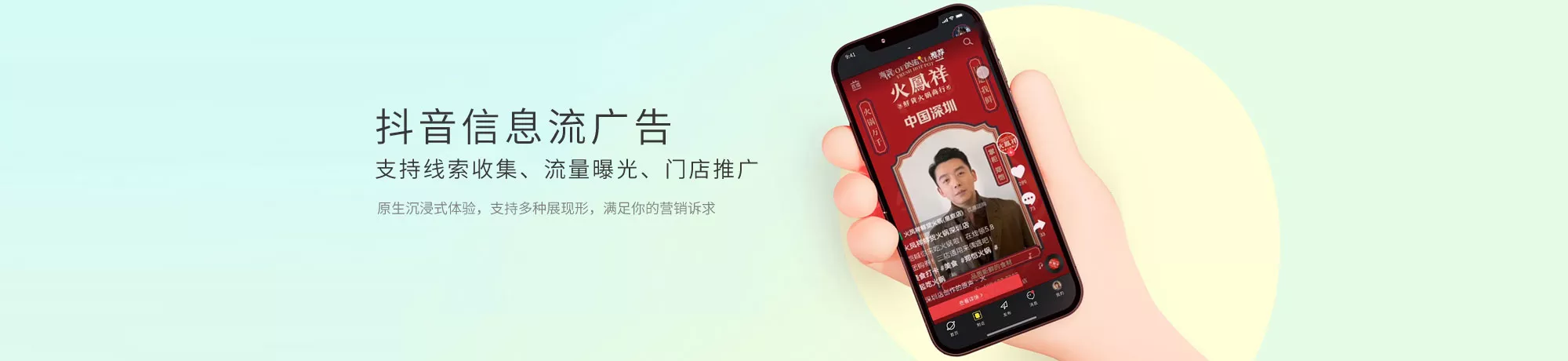 广告在抖音APP开屏展现,视觉冲击强,品牌曝光强。开屏广告也可与首位信息流融合,体验更沉浸。支持品牌、产品、活动推广。